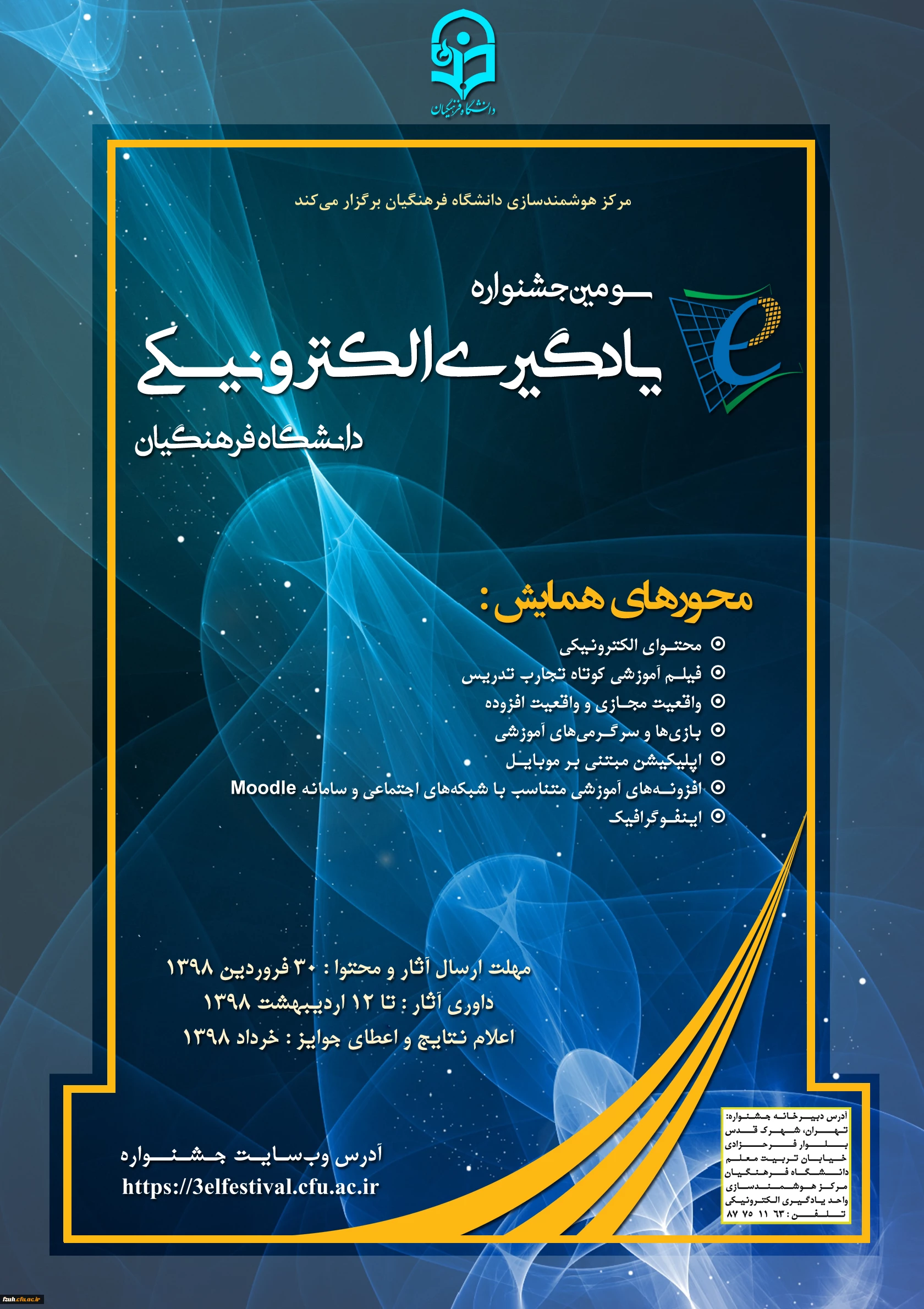 سومین جشنواره یادگیری الکترونیکی دانشگاه فرهنگیان با رویکرد توانمندسازی و توسعه استفاده از فناوری های جدید و روز دنیا در جهت گسترش آموزش های الکترونیکی و تولید محتوای آموزشی مورد نیاز و با توجه به مفاد بیانیه حضرت آقا در خصوص گام دوم انقلاب ، مفاد سند تحول بنیادین، سند برنامه درسی ملی و سند توسعه فناوری اطلاعات و ارتباطات آموزشی به همت مرکز هوشمندسازی دانشگاه در سال 1398 برگزار خواهد شد. مخاطبان این جشنواره اساتید، دانشجومعلّمان و کارکنان دانشگاه فرهنگیان هستند.